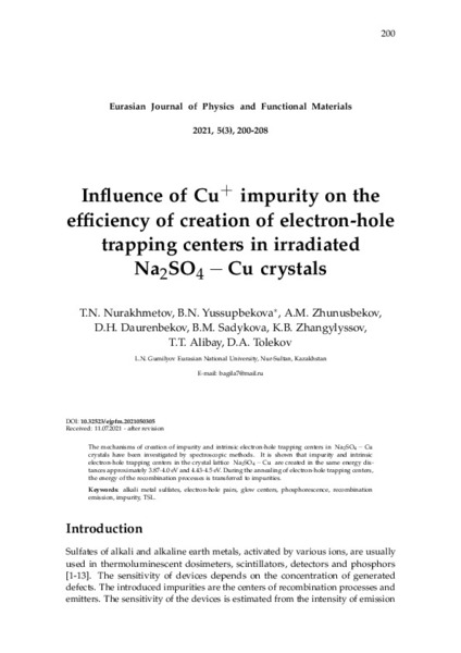 electron-hole trapping centers in the crystal lattice Na2SO4 − Cu are created in the same energy distances approximately 3.87-4.0 eV and 4.43-4.5 eV. During the annealing of electron-hole trapping centers,