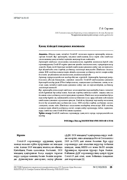 Мақала қазақ тіліндегі Covid-19 лексикасы туралы зерттеудің нәтижелерімен бөліседі. Бұл зерттеудің мақсаты пандемияның тілге әсерін және пандемия